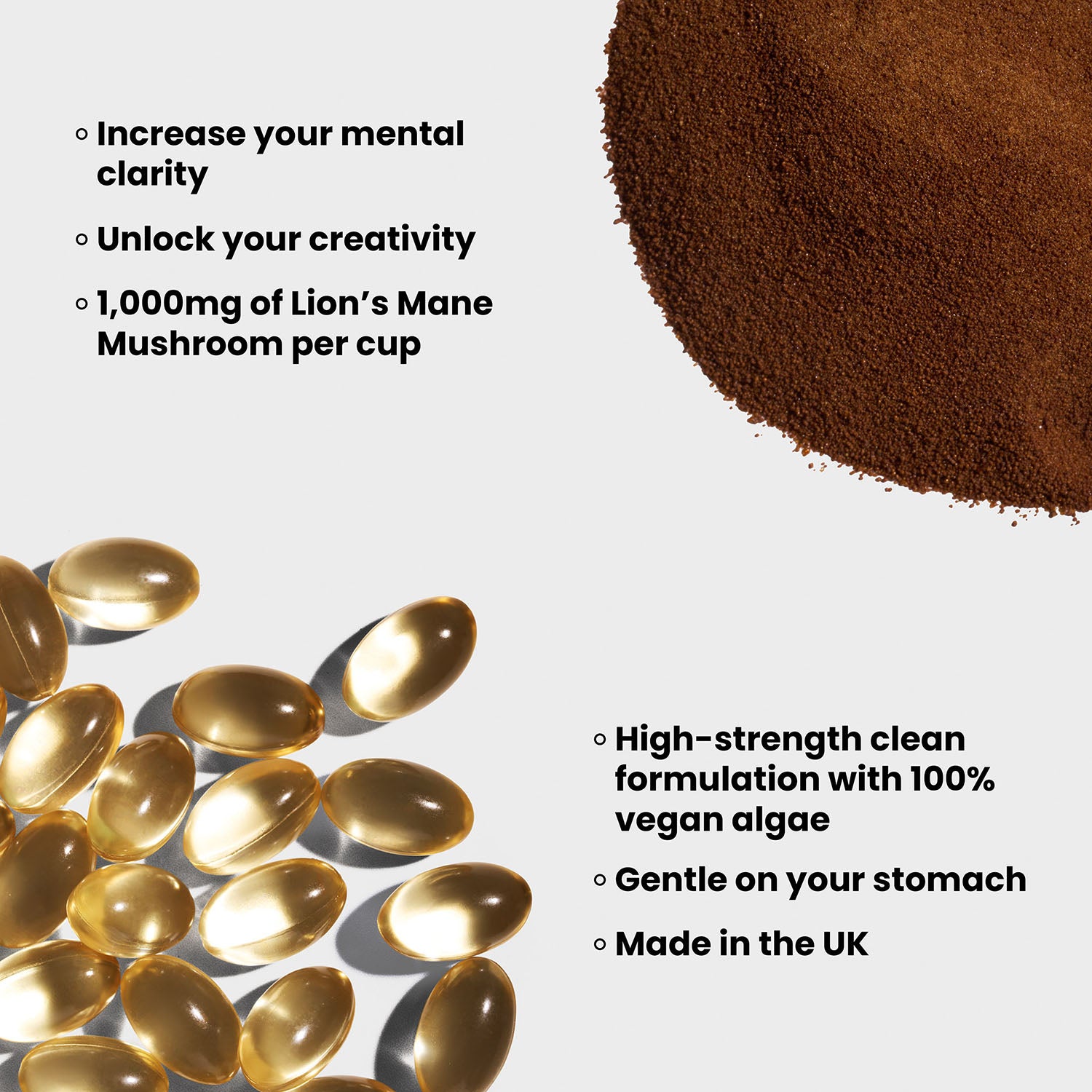 Our Mushroom Coffee and Omega-3 are both dairy-free, gluten-free, 100% vegan and does not contain artificial fillers or sweeteners.